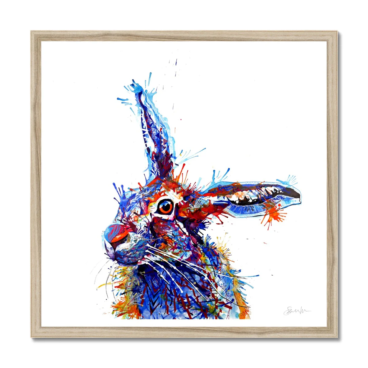 Barnaby the hare hopping in to say hello!Ā This hare painting framed print, with iconic ears, and bright colours!